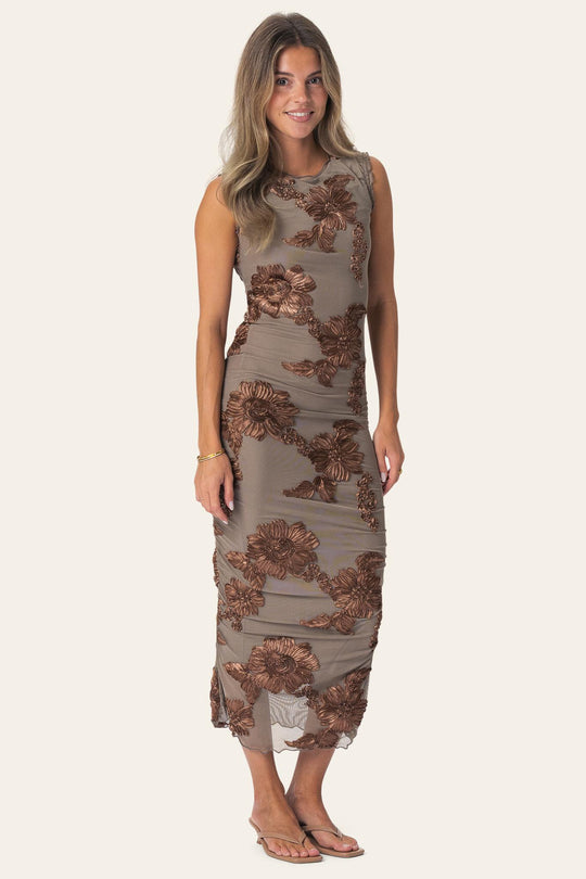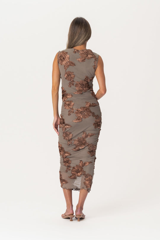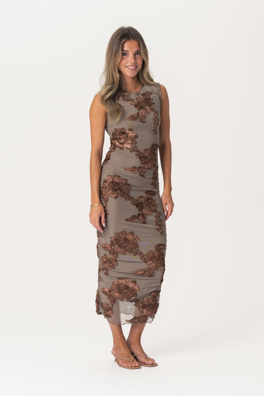 Elegant long dress in light brown with a form-fitting silhouette. The dress features short sleeves and a round neckline. It is adorned with brown 3D floral details throughout, adding extra character to the design. The edges of the dress have ruffle details, and the ruching on the sides allows you to adjust the length for a shorter look. The dress is made from a stretchy material.
