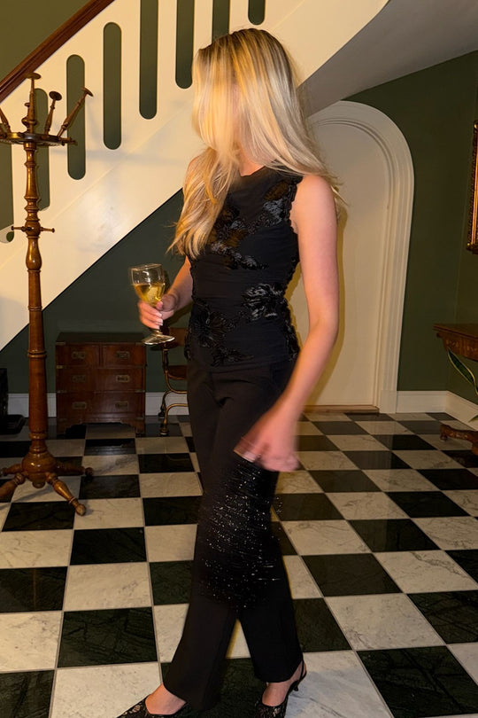 Tight fitted black flower mesh top with 3D flower details. The top is made from a stretchy mesh and has ruching details on the sides, small ruffles at the shoulders.