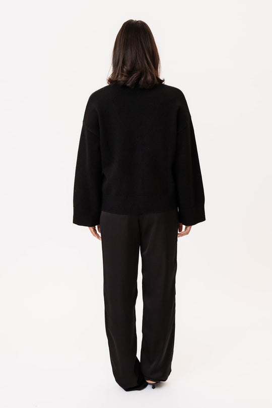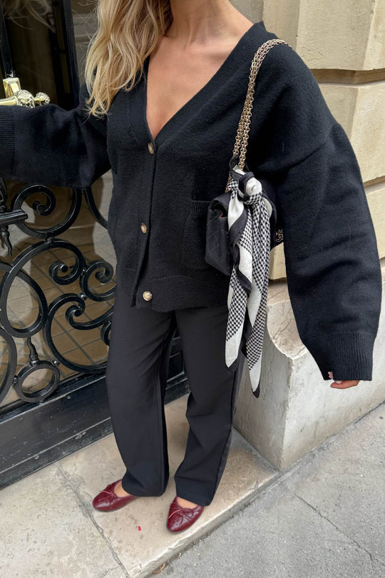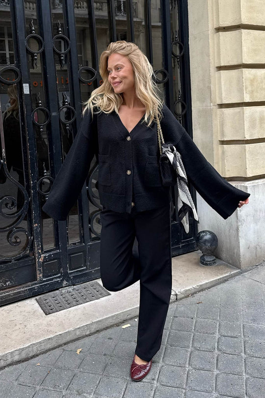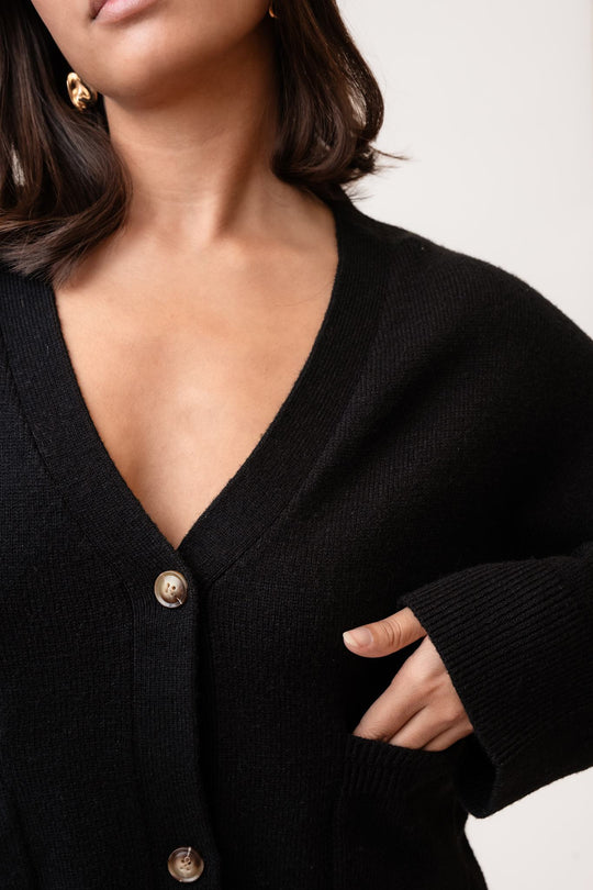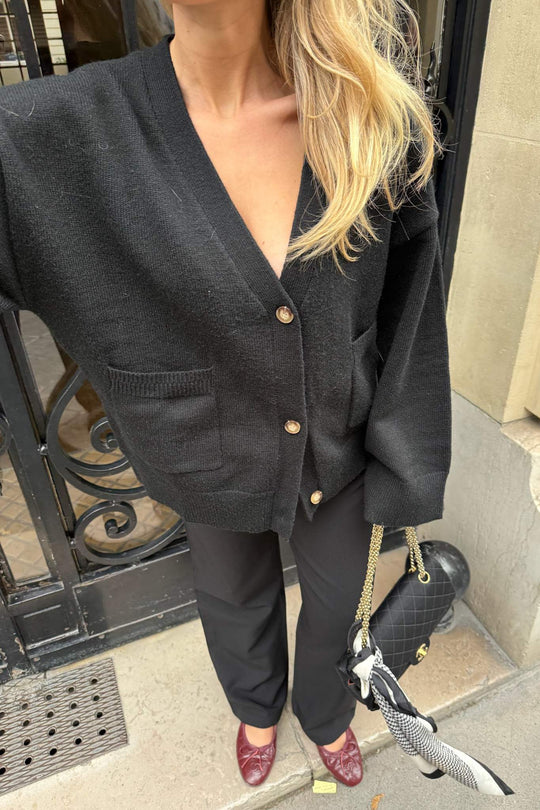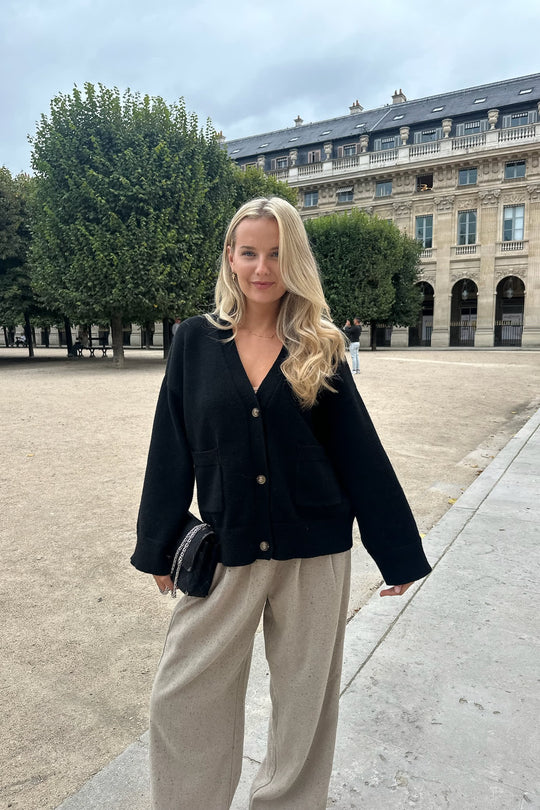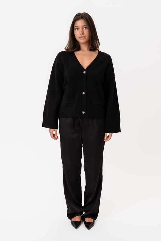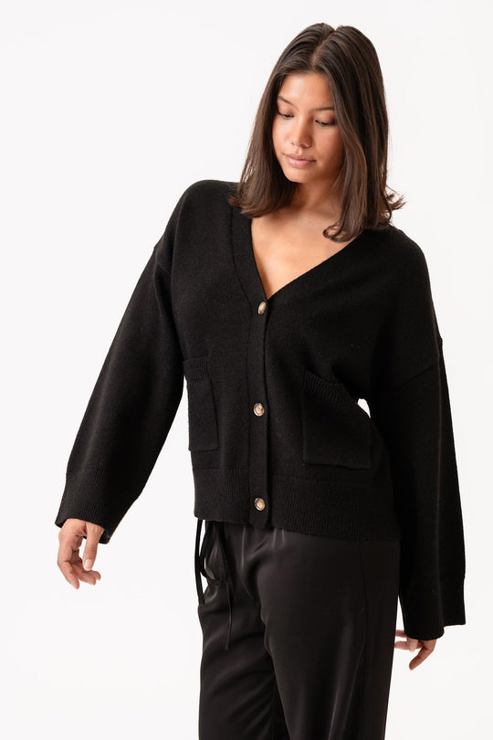 Soft boxy cardigan in woolblend with rib details. It has two big front pockets and 3 buttons as closure.