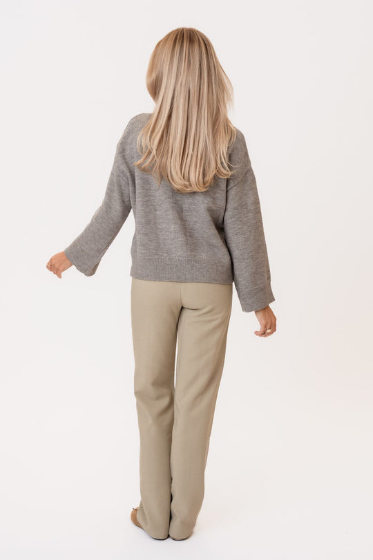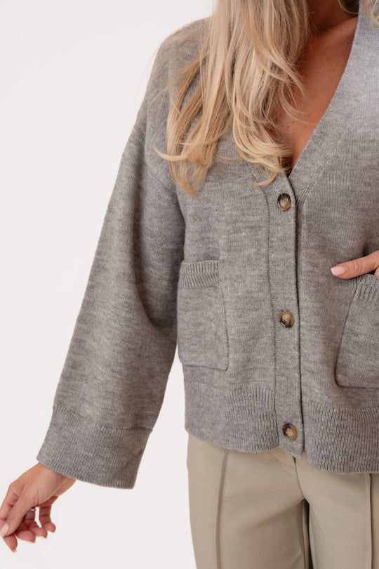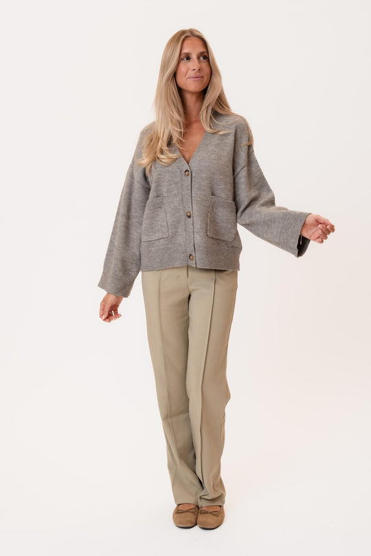 Soft boxy cardigan in woolblend with rib details. It has two big front pockets and 3 buttons as closure.