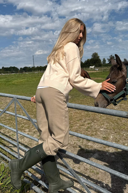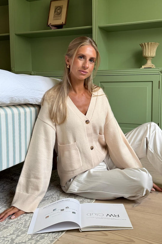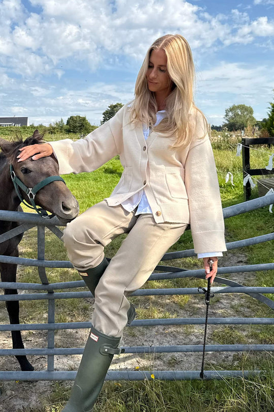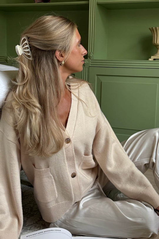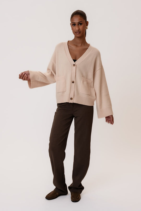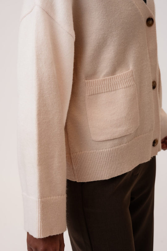 Soft boxy cardigan in woolblend with rib details. It has two big front pockets and 3 buttons as closure.