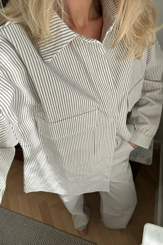 Oversize beige striped shirt with two big chest pockets and buttons down the front. Match it with our Nanna Pants.
