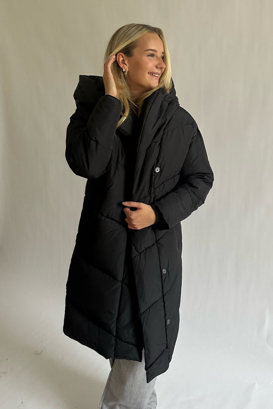 Perfect winter jacket with an oversized fit, a hoodie, pockets and buttons as closure.
