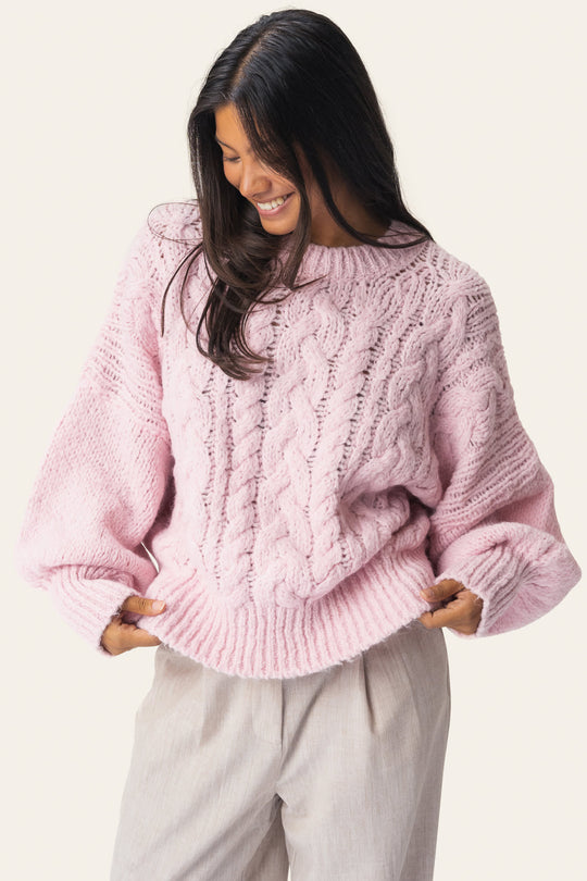 A cozy chunky knit sweater crafted from thick yarn. It features long sleeves with wide ribbed cuffs that create a softly puffed silhouette. The body has a relaxed fit and is adorned with beautiful cable knit details in the front. Finished with a round neckline, framed by a wide ribbed trim for a bold, classic look.