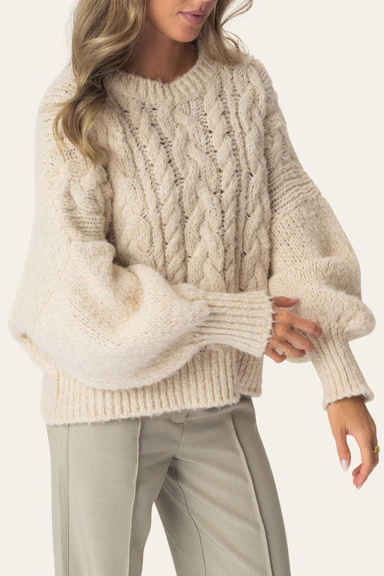 A cozy chunky knit sweater crafted from thick yarn. It features long sleeves with wide ribbed cuffs that create a softly puffed silhouette. The body has a relaxed fit and is adorned with beautiful cable knit details in the front. Finished with a round neckline, framed by a wide ribbed trim for a bold, classic look.