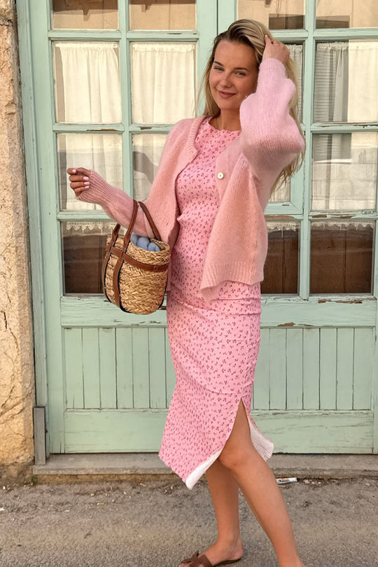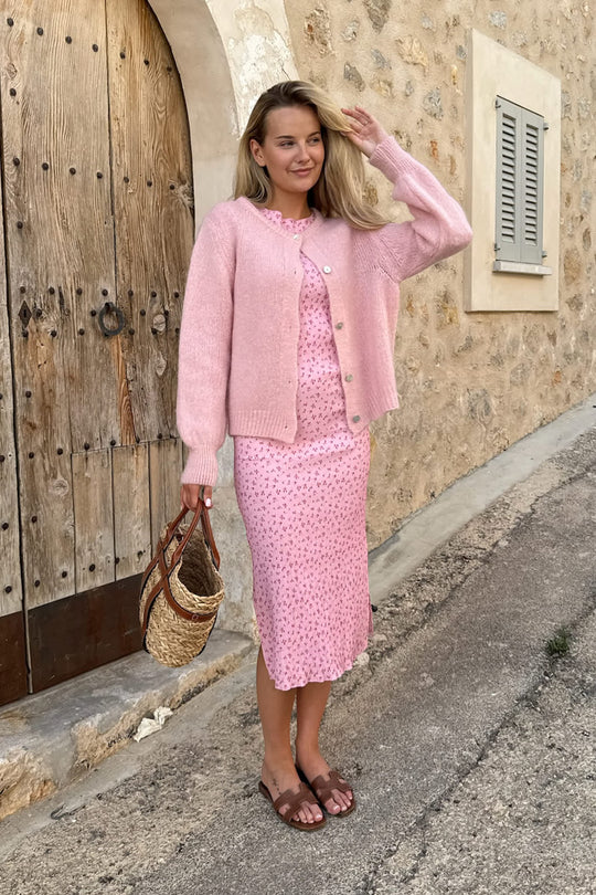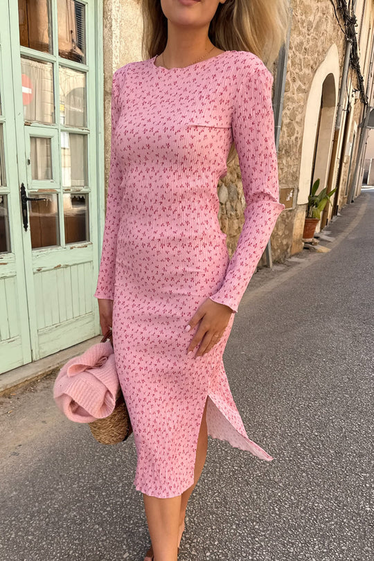 Beautiful plissé dress in pink floral print. The dress features long sleeves and a round neckline, both adorned with delicate ruffle details. It has slits on both sides, adding an elegant touch to the design. The dress is made from a stretchy material.
