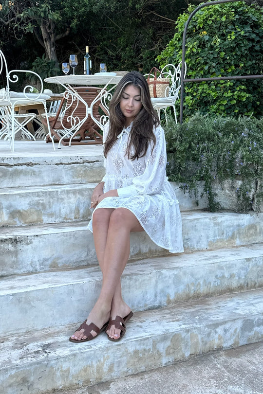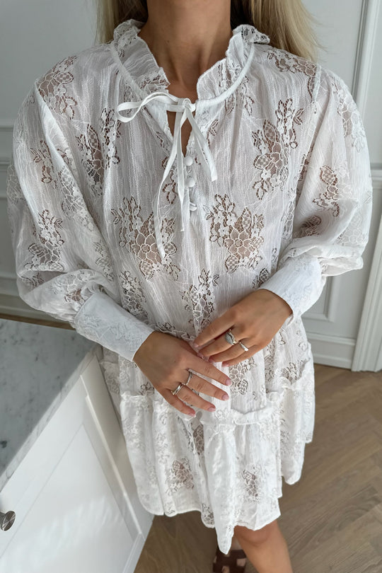 Long sleeved lace dress with frill details, three small buttons and a tie in the neck.