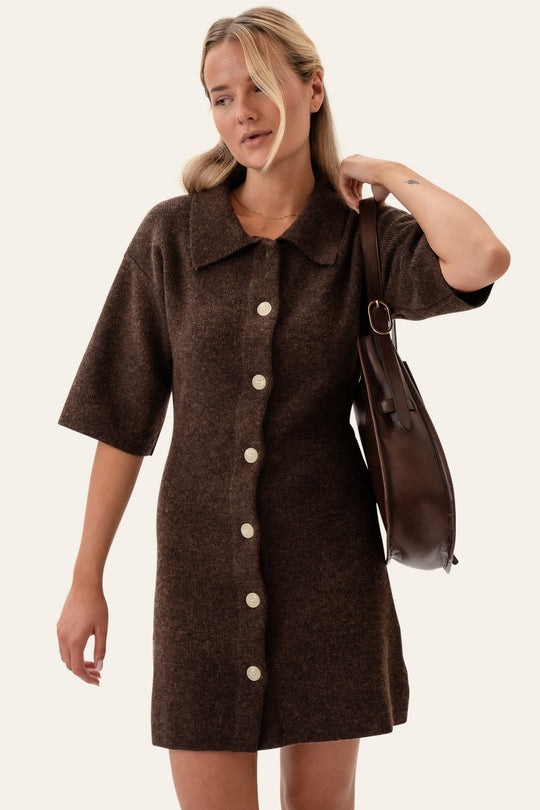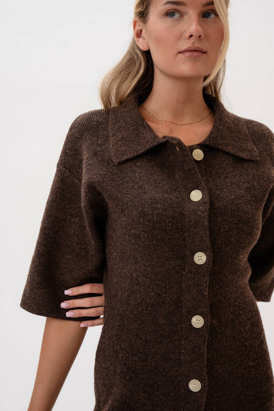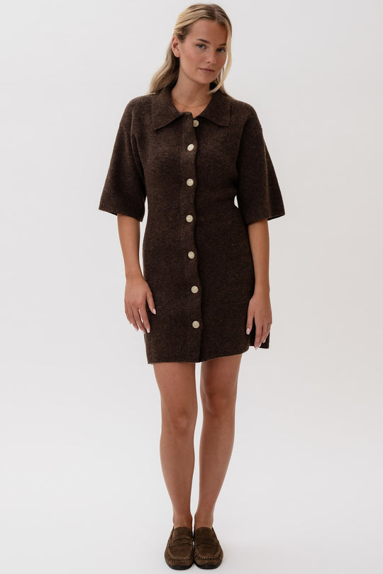 Soft knit dress in a dark brown wool blend. It has light colored nature buttons as closure and short wide sleeves. The dress is made from a stretchy material.