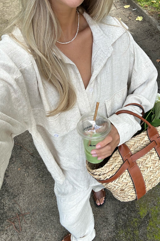 Beige linen shirt in an oversized fit with long cuffs and two big pockets on the chest. Match it with our Hannah Pants.