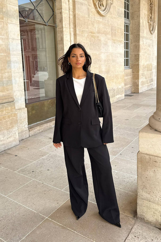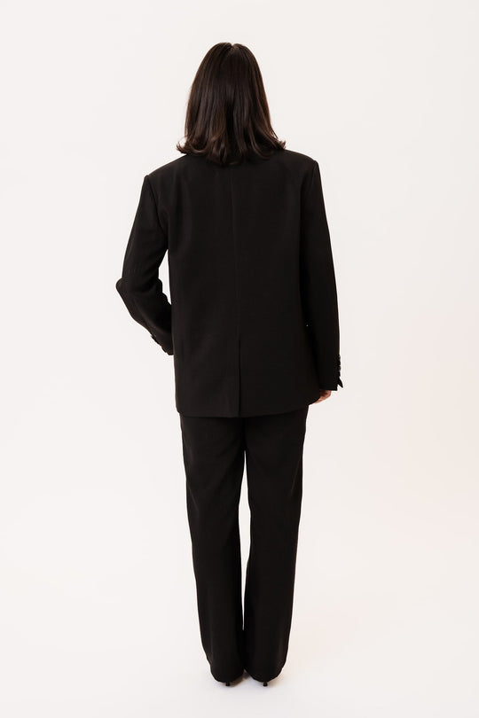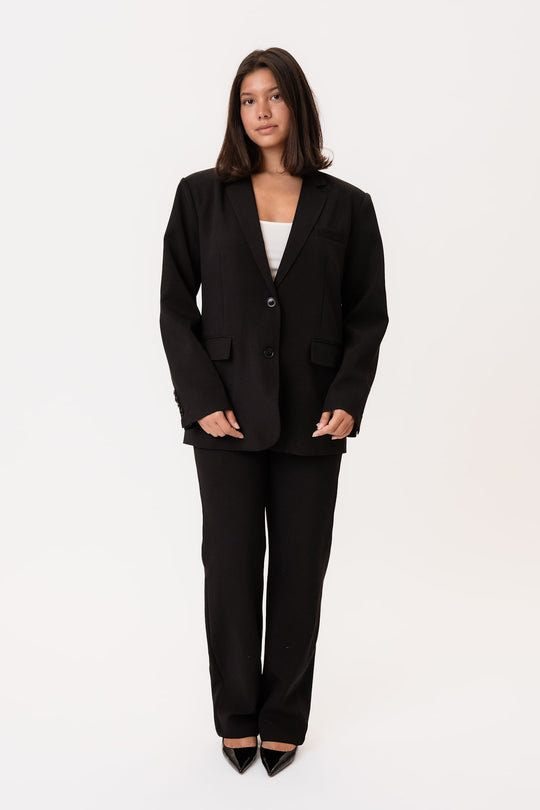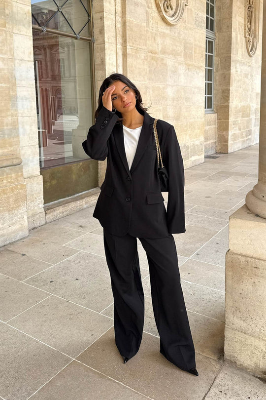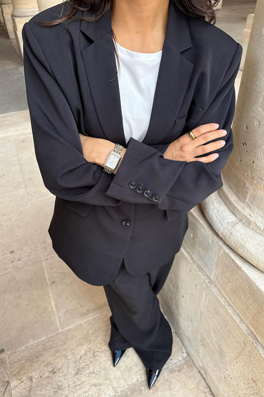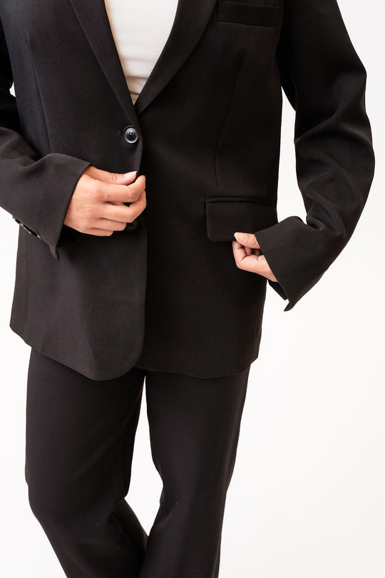 Black blazer in a beautiful fabric. It features a straight fit and straight sleeves with button detailing at the cuffs. There is one pocket on the left chest, two front pockets at the bottom, and a shirt-style collar that dips into a V at the front, where two buttons serve as the closure. A slit at the back adds an elegant touch to the overall look.