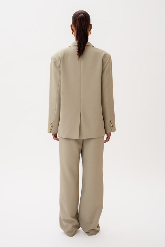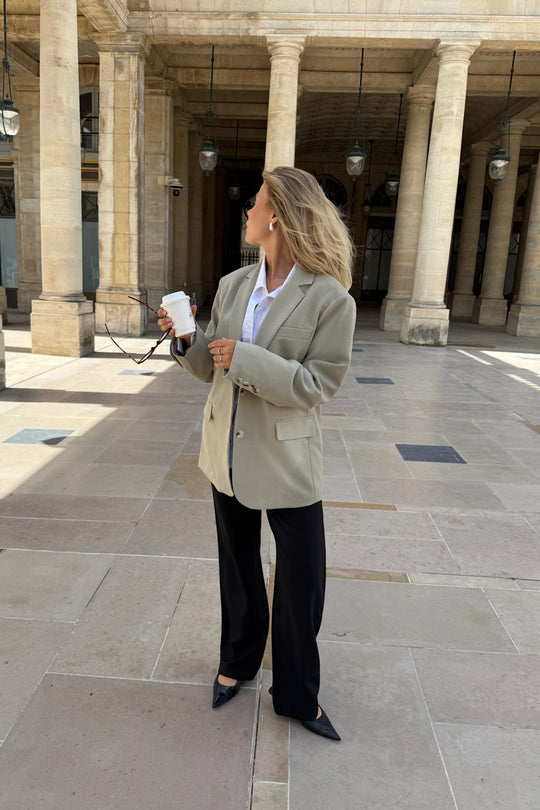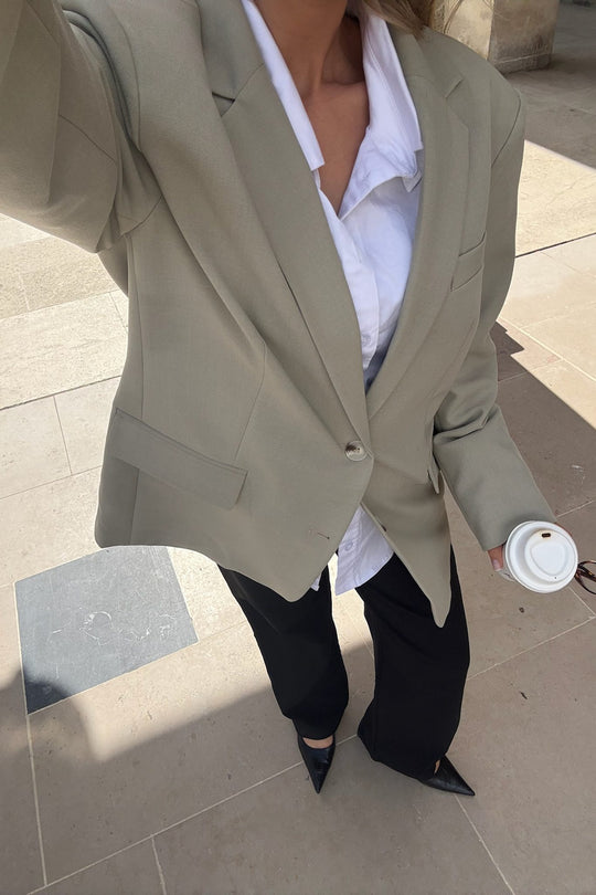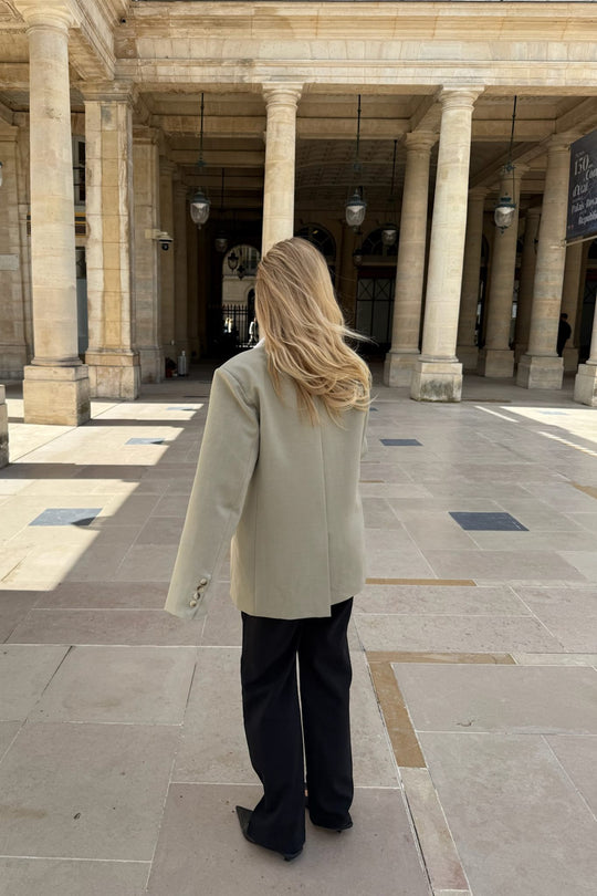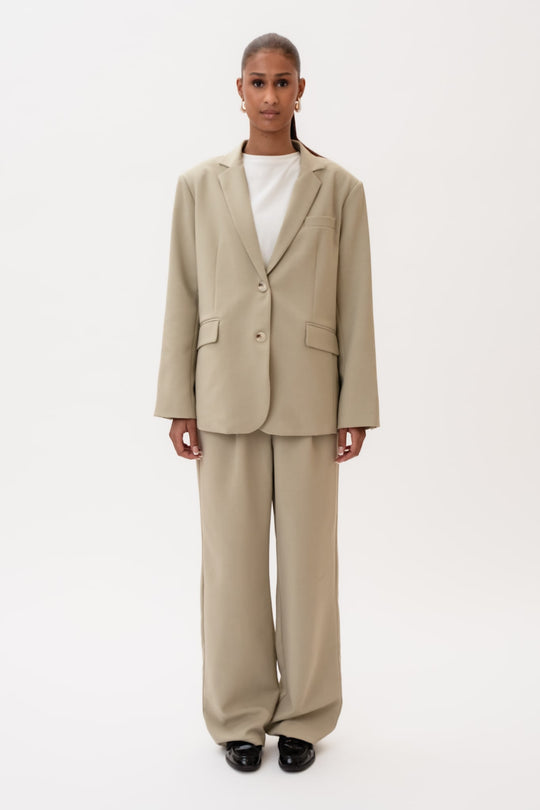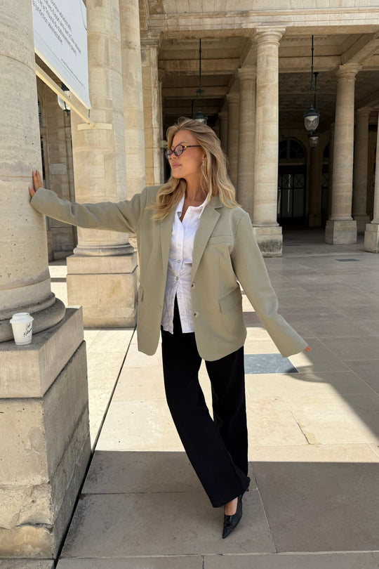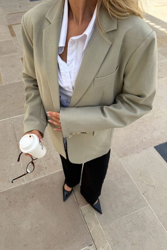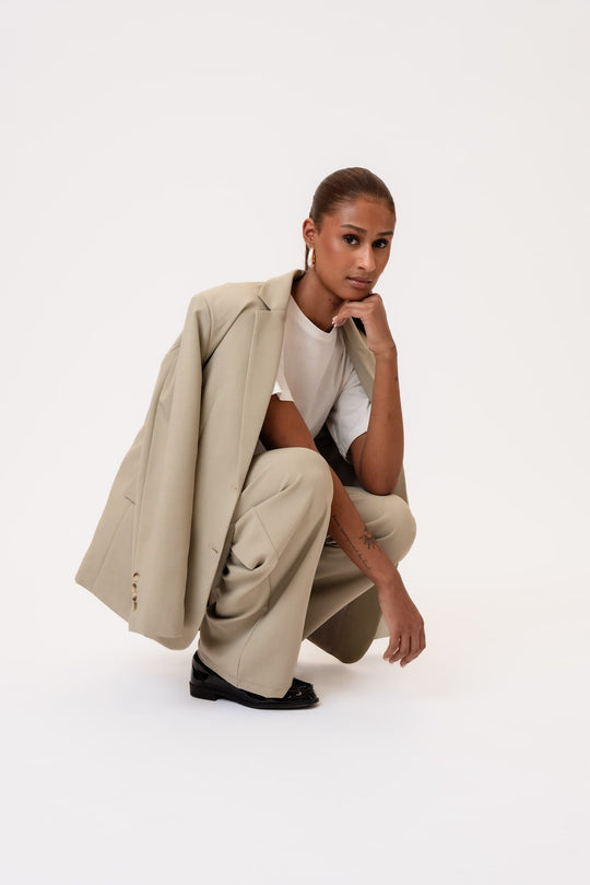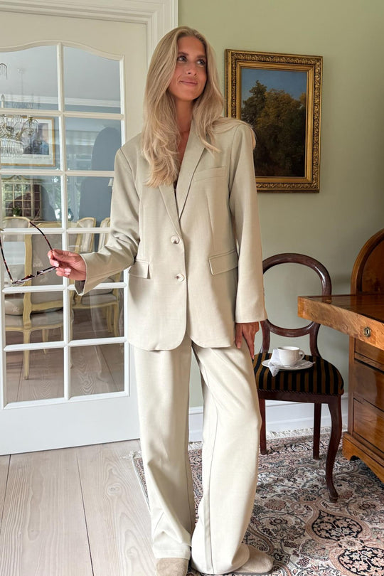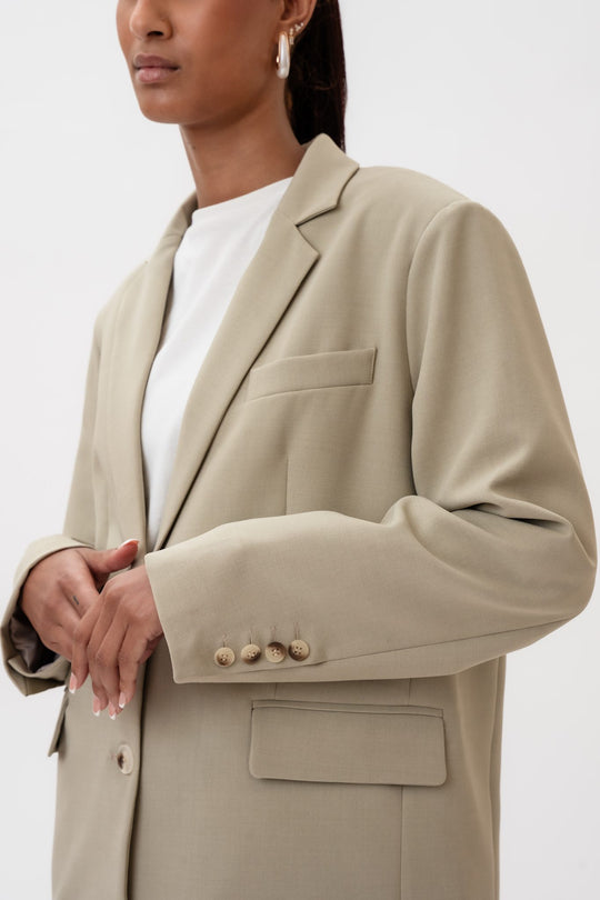Dusty beige blazer in a beautiful fabric. It features a straight fit and straight sleeves with button detailing at the cuffs. There is one pocket on the left chest, two front pockets at the bottom, and a shirt-style collar that dips into a V at the front, where two buttons serve as the closure. A slit at the back adds an elegant touch to the overall look.
