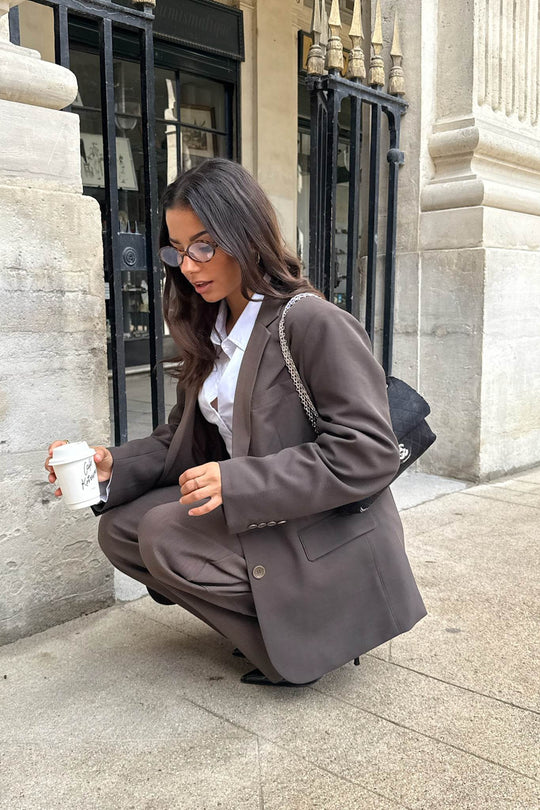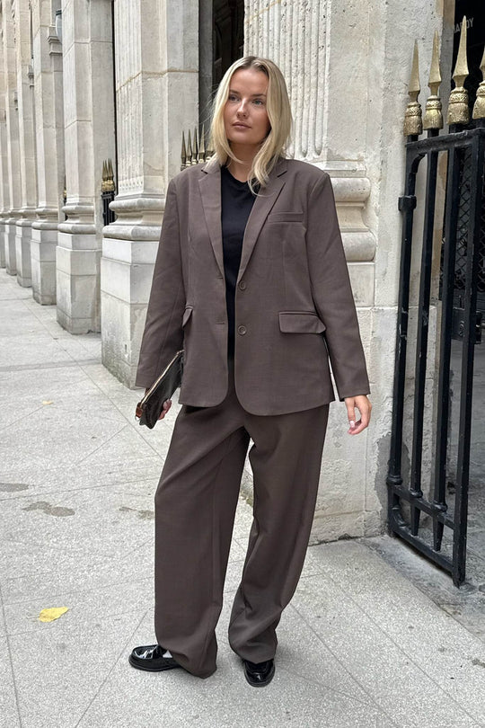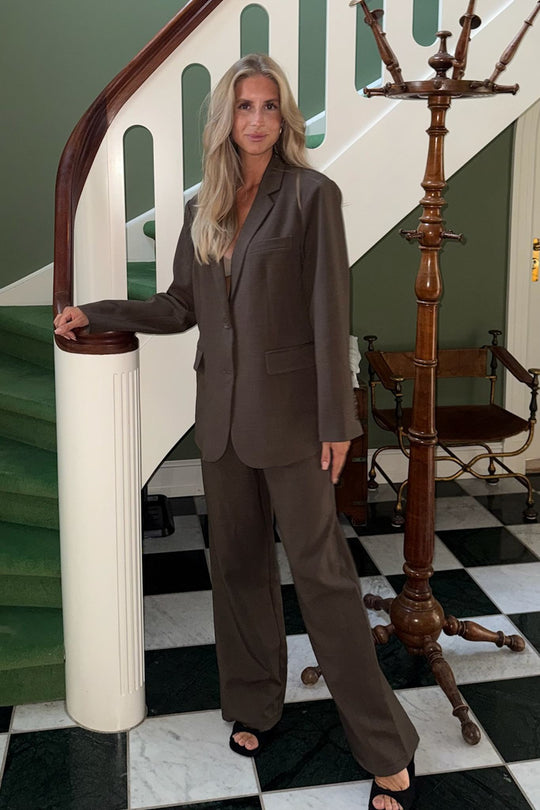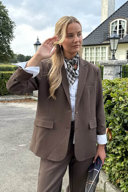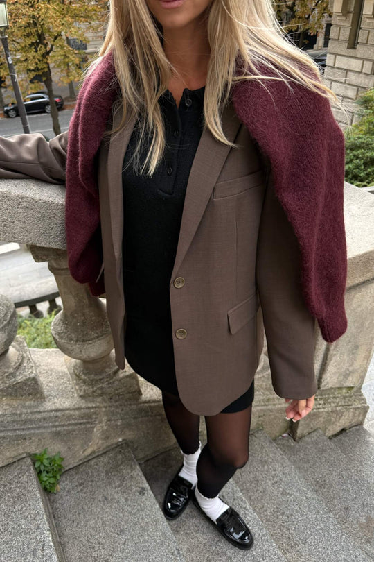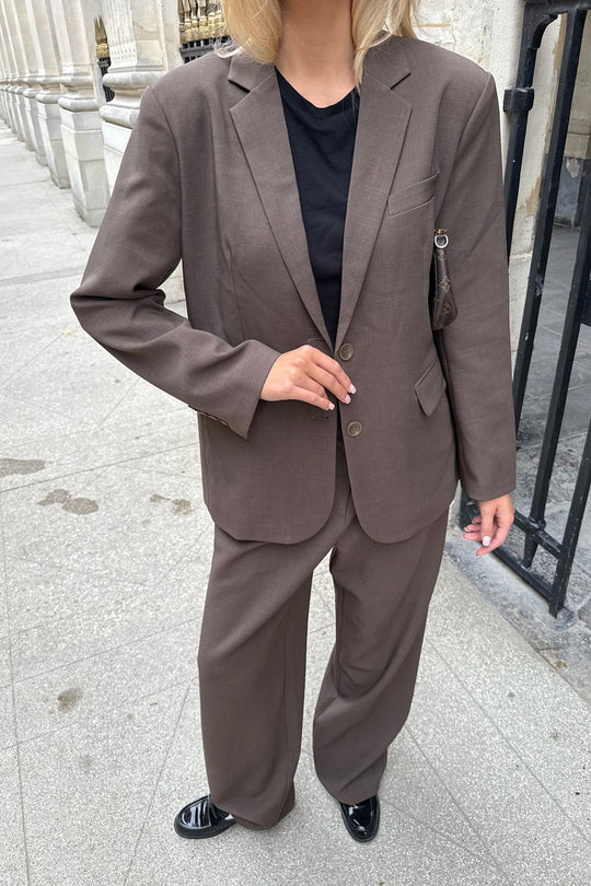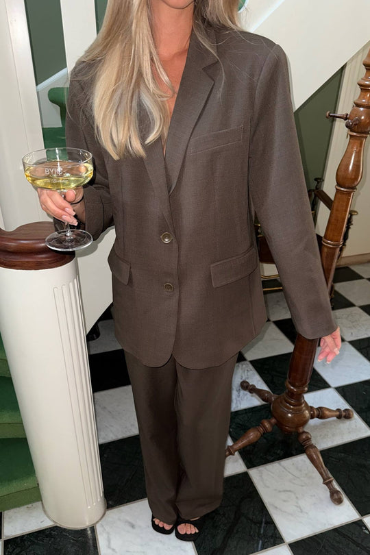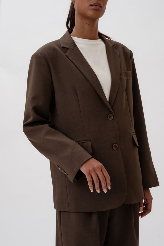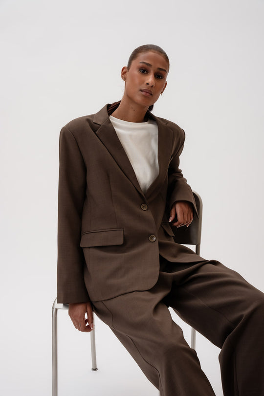 Dark brown blazer in a beautiful fabric. It features a straight fit and straight sleeves with button detailing at the cuffs. There is one pocket on the left chest, two front pockets at the bottom, and a shirt-style collar that dips into a V at the front, where two buttons serve as the closure. A slit at the back adds an elegant touch to the overall look.