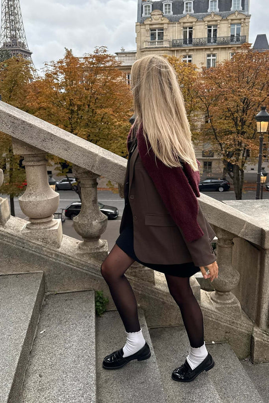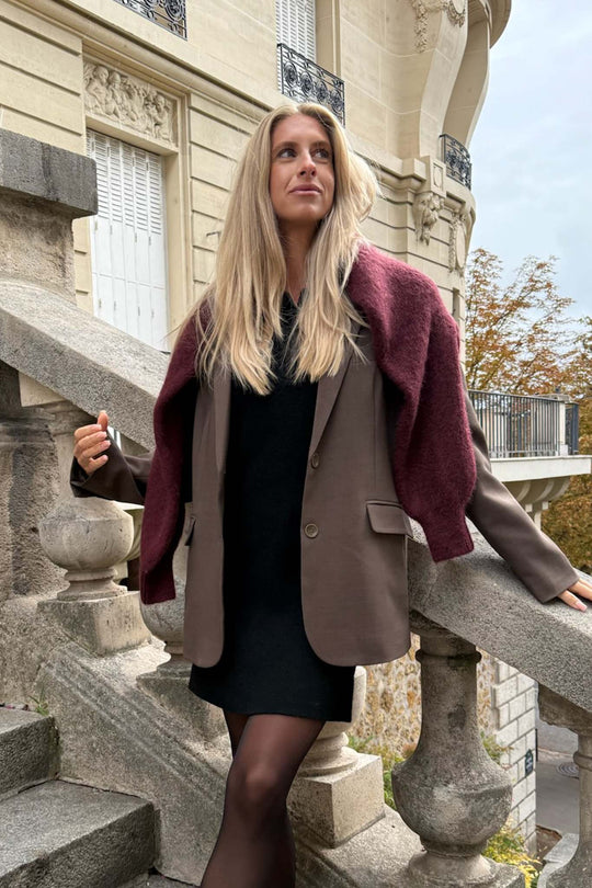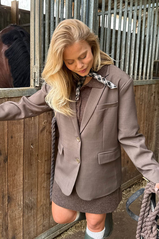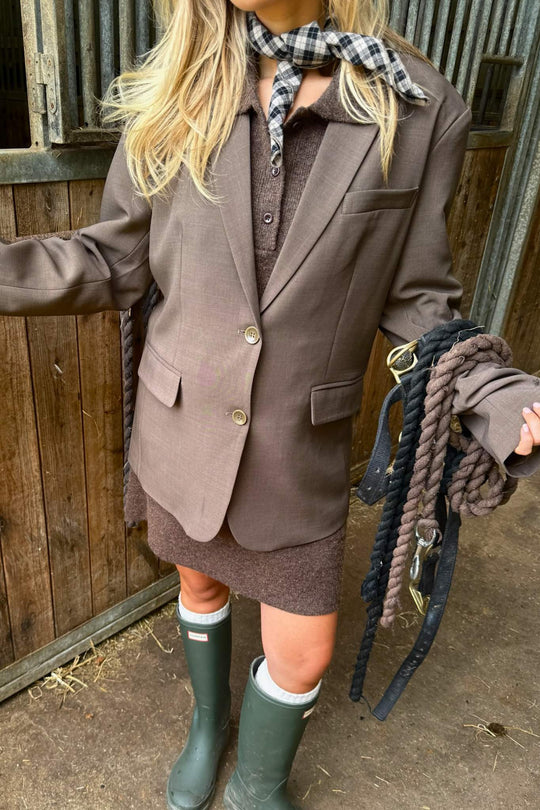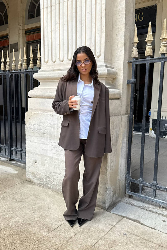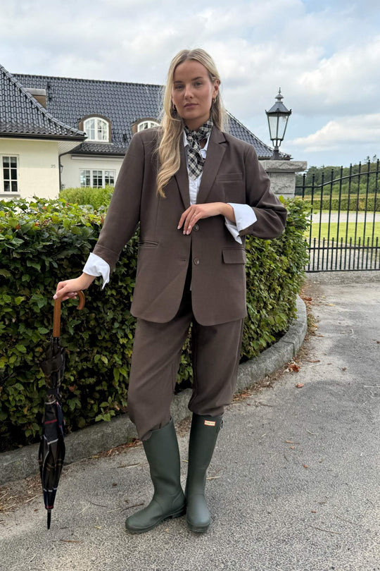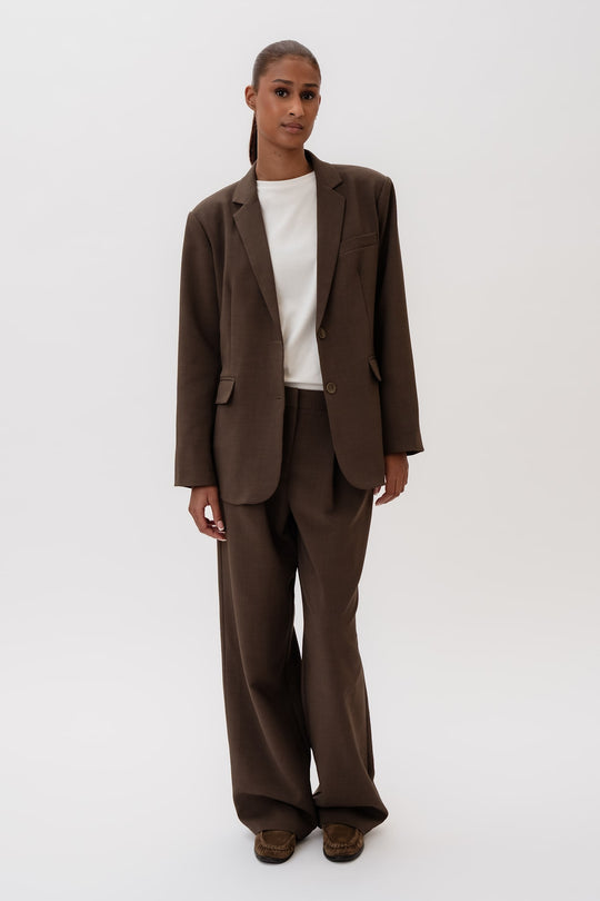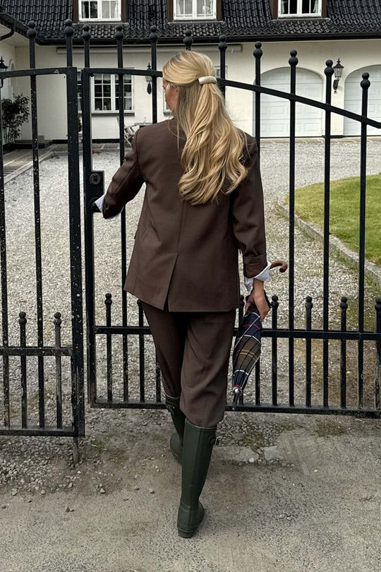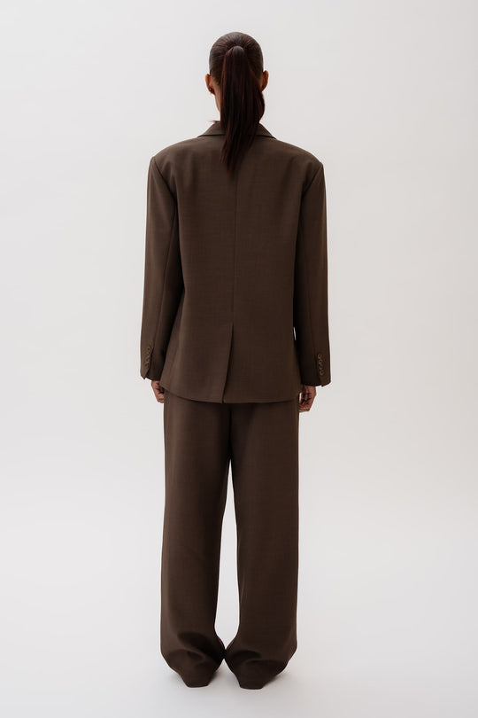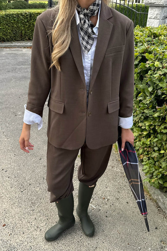 Dark brown blazer in a beautiful fabric. It features a straight fit and straight sleeves with button detailing at the cuffs. There is one pocket on the left chest, two front pockets at the bottom, and a shirt-style collar that dips into a V at the front, where two buttons serve as the closure. A slit at the back adds an elegant touch to the overall look.