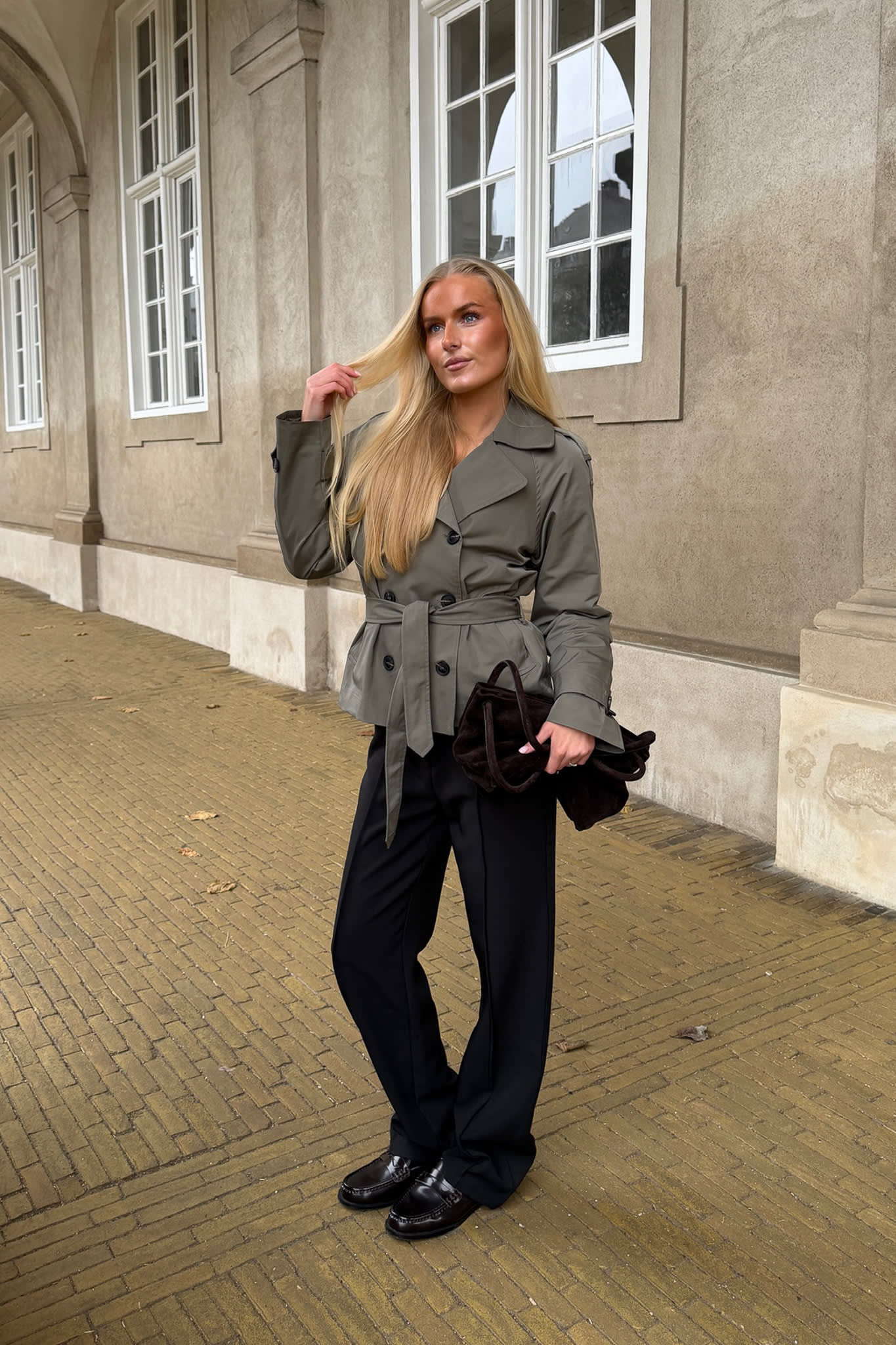 A modern and elegant short trench jacket with a timeless silhouette. The design features a double-breasted front, waist tie belt, and buttoned cuff details for a refined look. Structured shoulders and clean lines add a feminine and sophisticated touch, while the short length makes it ideal for transitional seasons. Crafted from a lightweight, smooth fabric that holds its shape and provides a polished finish – a versatile wardrobe staple for both everyday wear and more dressed-up occasions.