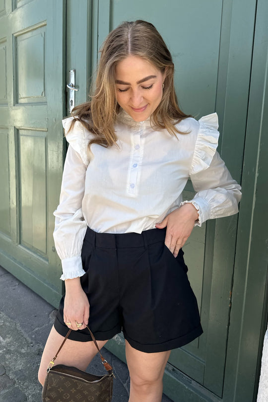 Black shorts in a mix of linnen, fake backpockets, a zipper and button as closure.